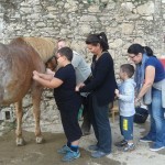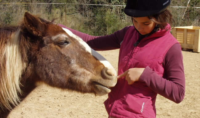 Una sesión de equinoterapia empieza con saludar y acercamiento al caballo para establecer desde el principio una relación con el animal de confianza y responsabilidad.